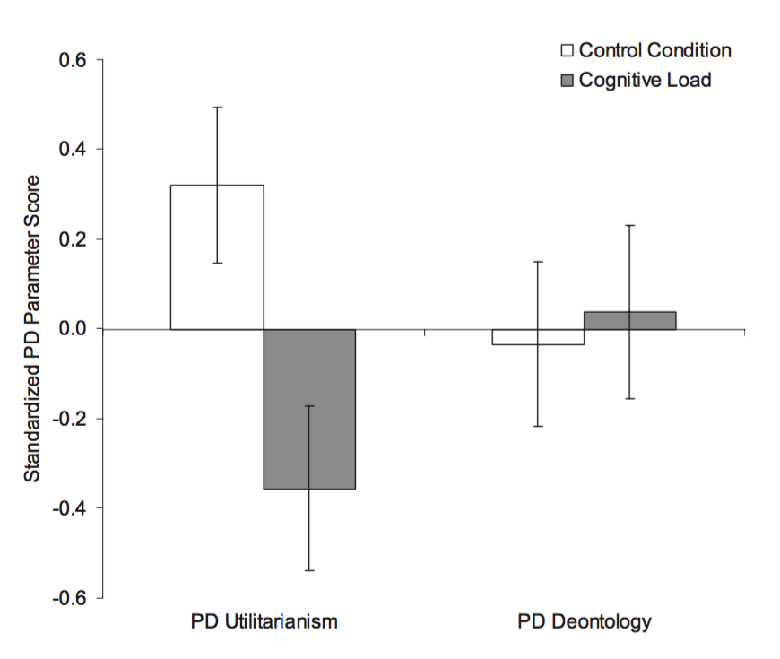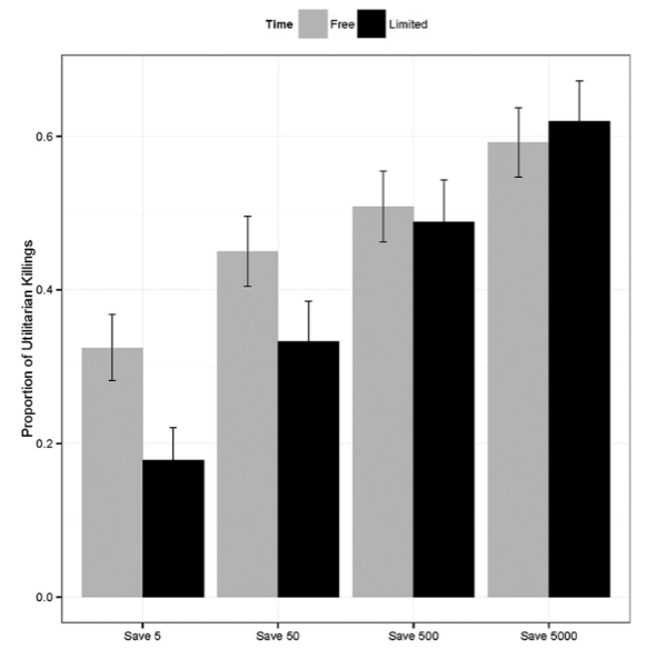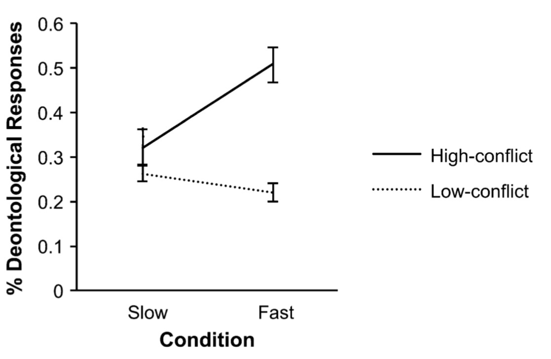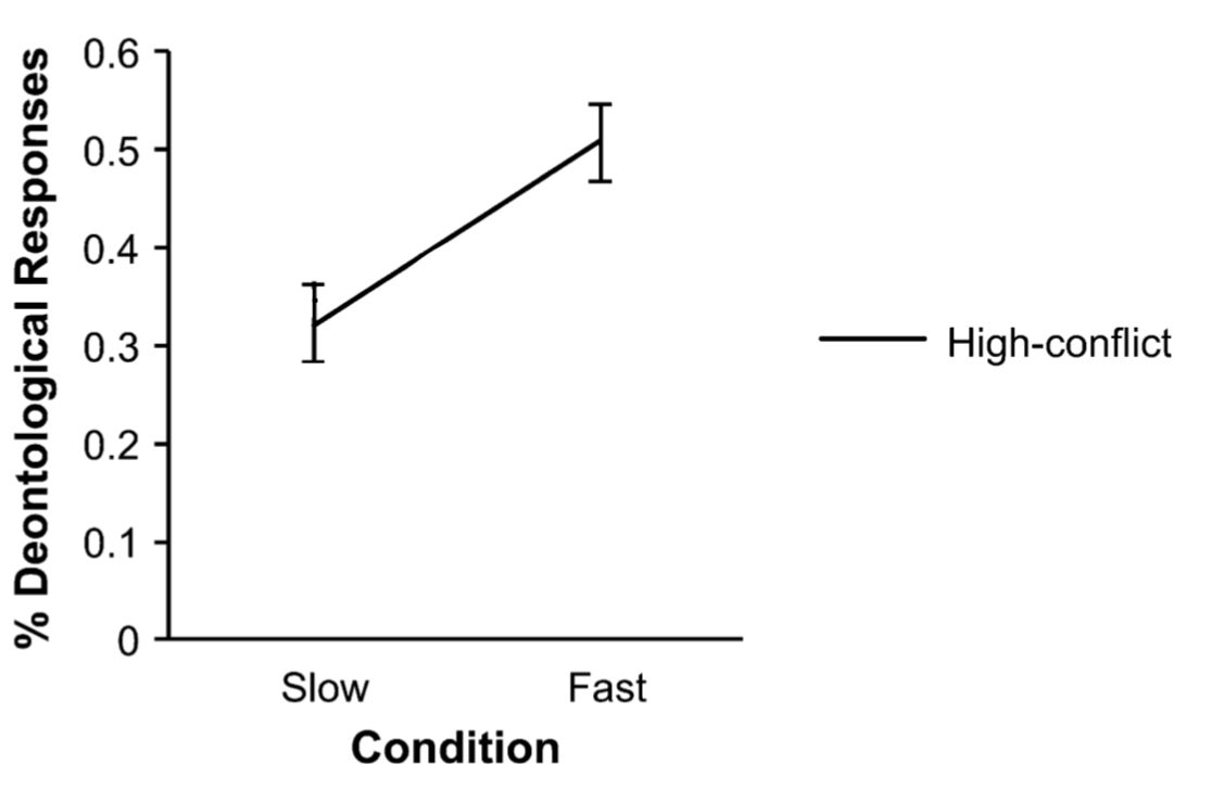 ‘participants in the time-pressure condition, relative to the no-time-pressure condition, were more likely to give ‘‘no’’ responses in high-conflict dilemmas’