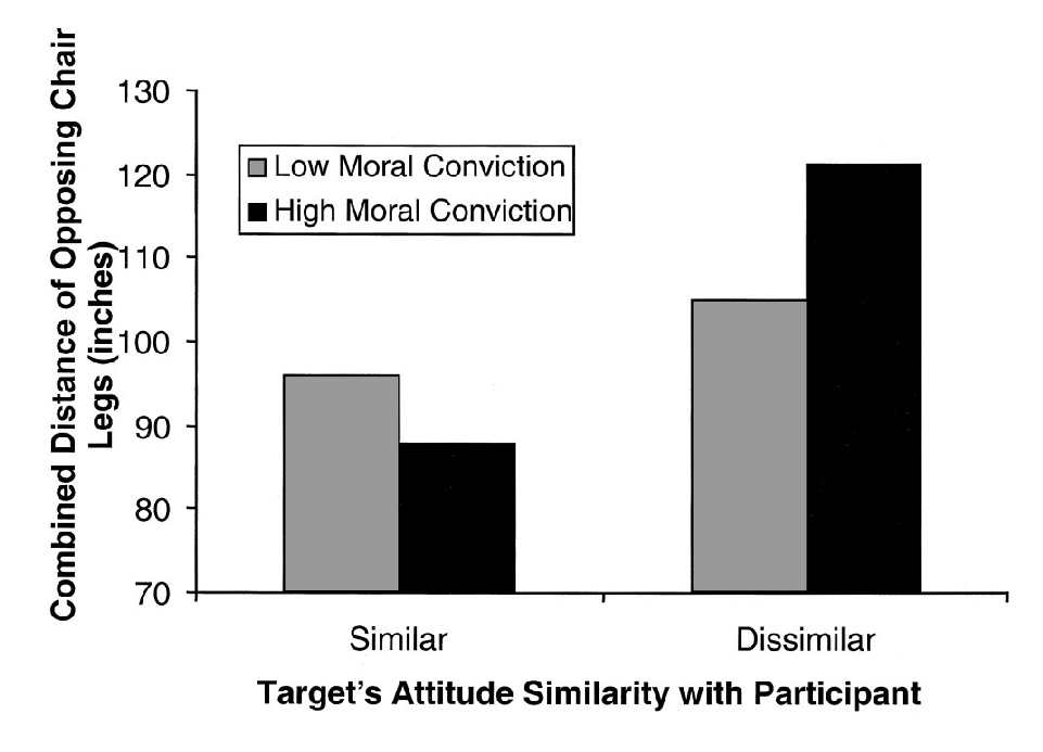 ‘In contrast, participants were more tolerant of having a distant than an intimate relationship with an attitudinally dissimilar other, when the attitude dissimilarity was on an issue that the participant held with low moral conviction, results that held even when we controlled for attitude strength.’