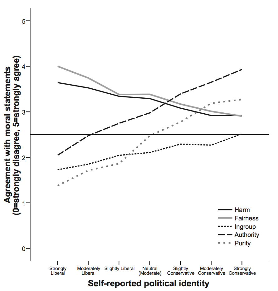 ‘Moral-foundations researchers have investigated the similarities and differences in morality among individuals across cultures (Haidt & Joseph, 2004). These researchers have found evidence for five >1 fundamental domains of human morality’